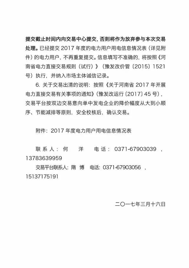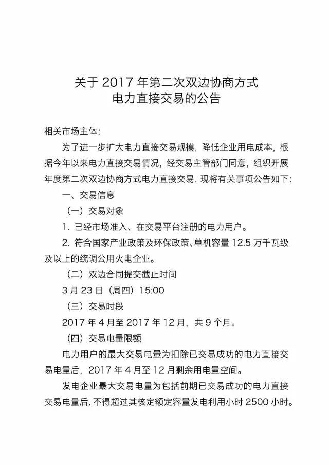 河南省2017年度第二次雙邊協(xié)商交易合同提交截止時間是3月23日(周四)15:00,這將會是河南2017年度最后一次雙邊協(xié)商交易,此次交易電量規(guī)模為2017年4月至12月剩余用電量空間。(本文轉(zhuǎn)載自:晶見微信公眾號 微信