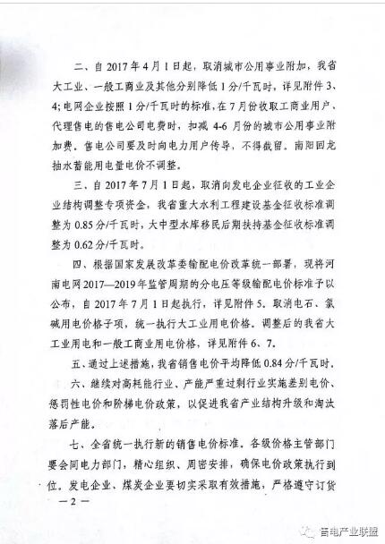 其中,燃煤發(fā)電機組標桿上網電價統一提高2.28分/千瓦時;取消城市公用事業(yè)附加,大工業(yè)、一般工商業(yè)及其他分別降低1分/千瓦時,電網企業(yè)按照1分/千瓦時的標準;取消向發(fā)電企業(yè)征收的工業(yè)企業(yè)結構調整專項資金,重大水利工程建設基金征收標準調整為0.85分/千瓦時,大中型水庫移民后期扶持基金征收標準調整為0.62分/千瓦時。河南省銷售電價平均降低0.84分/千瓦時。