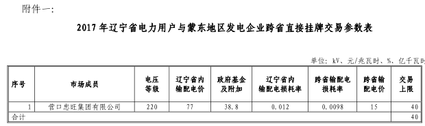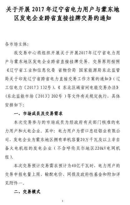 北京電力交易中心發(fā)布了《關(guān)于開展2017年遼寧省電力用戶與蒙東地區(qū)發(fā)電企業(yè)跨省直接掛牌交易的通知》,本次交易預(yù)計(jì)交易需求為40億千瓦時(shí)。電力用戶為營(yíng)口忠旺鋁業(yè)有限公司,發(fā)電企業(yè)為蒙東地區(qū)擁有單機(jī)容量20萬