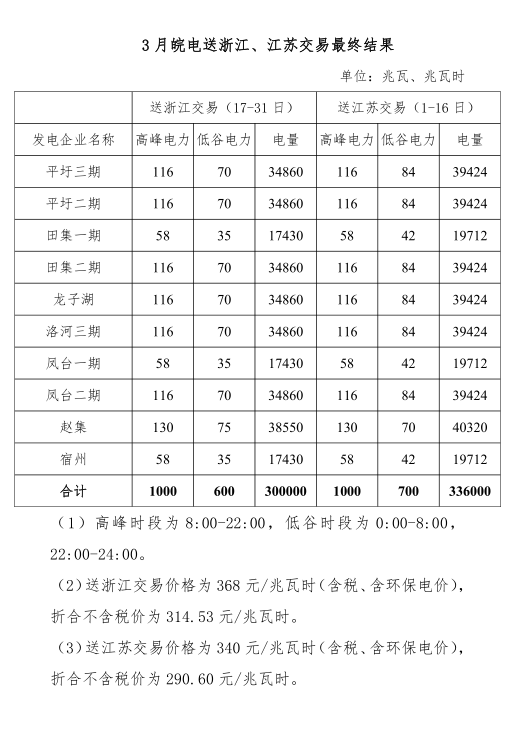 3月皖電送浙江、江蘇交易最終結(jié)果