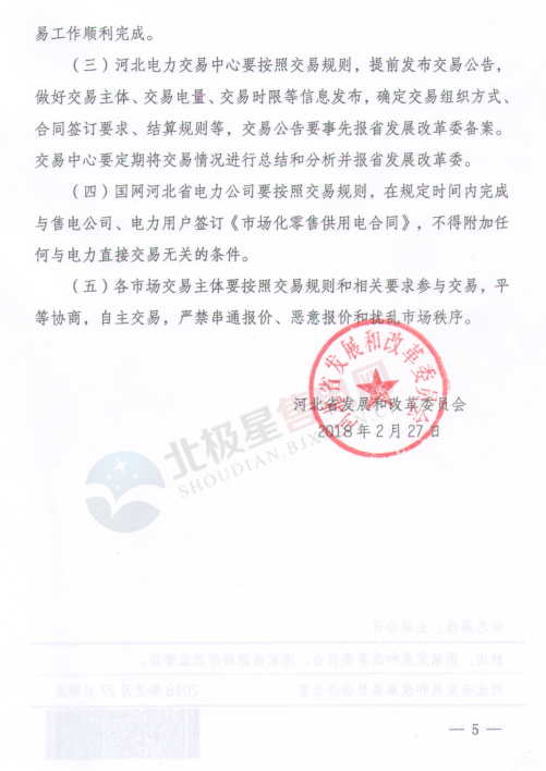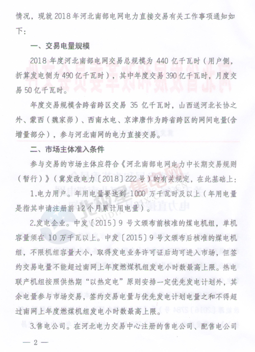 河北省發(fā)改委日前發(fā)布了《關于開展2018年河北南部電網電力直接交易工作的通知》,通知中稱,2018年度河北南部電網交易總規(guī)模為440億千瓦時...
