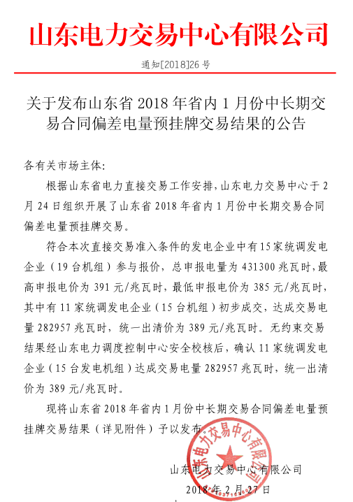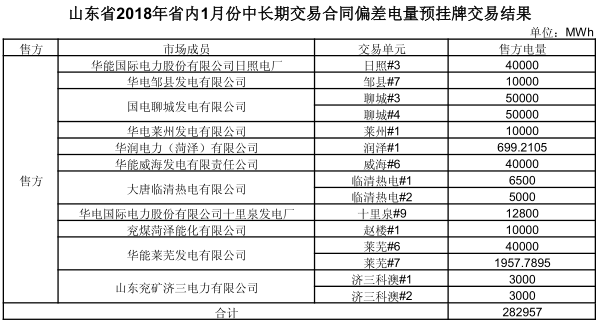 山東2018年省內(nèi)1月中長(zhǎng)期交易合同偏差電量預(yù)掛牌交易結(jié)果:交易電量282957兆瓦時(shí)