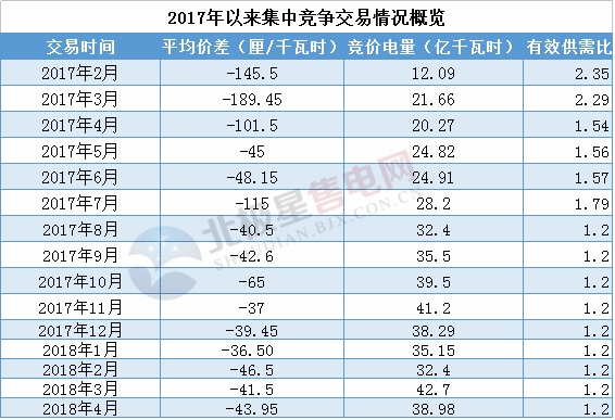 從2017年8月份開(kāi)始,廣東的月度集中競(jìng)價(jià)的有效供需比就鎖定在了1.2,這也從客觀上決定了月度競(jìng)價(jià)價(jià)差的趨穩(wěn),2017年,廣東共組織了11場(chǎng)月度競(jìng)爭(zhēng)交易,累計(jì)成交電量319.6億千瓦時(shí),平均價(jià)差為-68.9厘/千瓦時(shí)。從今年已經(jīng)進(jìn)行的4場(chǎng)交易來(lái)看,一共成交電量149.23億千瓦時(shí),平均價(jià)差在-42.11厘/千瓦時(shí)。