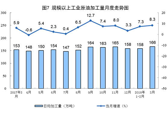 受去年下半年國內(nèi)新增煉化產(chǎn)能陸續(xù)投產(chǎn)和2018年首批原油進口配額大幅增加影響,一季度原油加工量明顯增長,同比增長7.5%,增速比去年同期加快3.0個百分點。3月份,原油加工量同比增長8.3%,日均加工166.2萬噸,為歷史最高水平。其中,汽油、煤油和柴油產(chǎn)量分別增長5.7%、14.6%和1.3%。