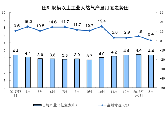一季度,天然氣產(chǎn)量396.7億立方米,同比增長3.3%,受基數(shù)較高影響,增速比去年同期回落0.1個百分點。3月份,天然氣產(chǎn)量同比增長0.4%,日均生產(chǎn)4.4億立方米,依然保持最高日產(chǎn)水平。