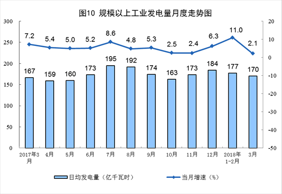 ?一季度發(fā)電1.6萬億千瓦時,發(fā)電量快速增長,同比增長8.0%,增速比去年同期加快1.3個百分點。3月份,全國平均氣溫較常年同期偏高2.9℃,而去年同期氣溫接近常年,且本月較去年同期少1個工作日,受此影響,發(fā)電量增速有所回落,同比增長2.1%。