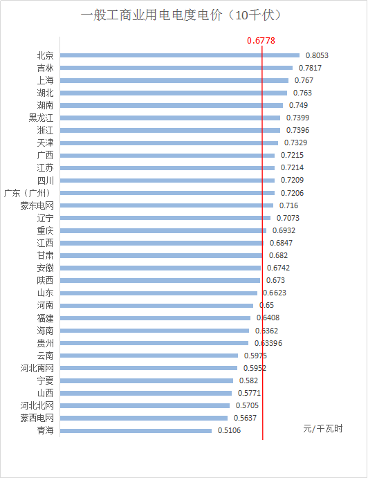 2、10千伏電壓等級(jí)下,全國(guó)平均電價(jià)約為0.6778元/千瓦時(shí),其中,北京最高為0.8053元/千瓦時(shí),青海最低為0.5106元/千瓦時(shí)。