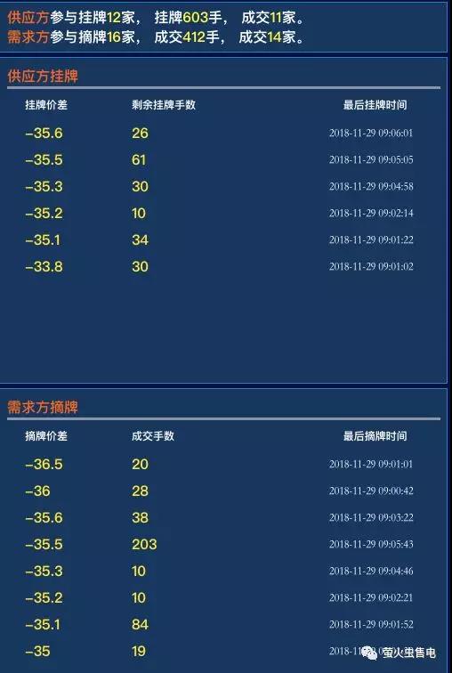 而另一邊,供應方掛牌,需求方摘牌的情況則比較符合市場理性。全部摘了-35厘/千瓦時以上的價格,最高摘了-36.5厘/千瓦時的價格。