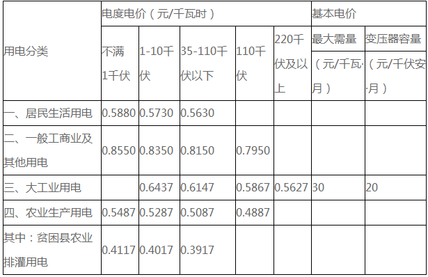 注: 1、上表所列價(jià)格,除貧困縣農(nóng)業(yè)排灌用電外,均含國家重大水利工程建設(shè)基金0.28分錢、農(nóng)網(wǎng)改造還貸資金2分錢。