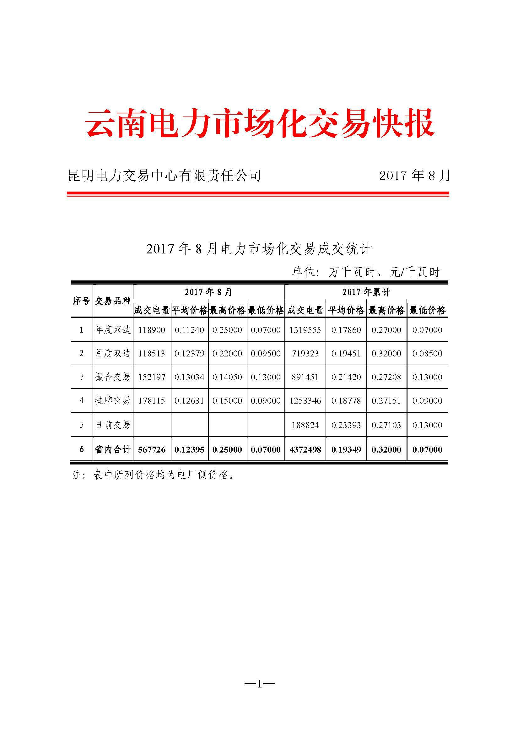 ,云南電力交易中心8月10日發(fā)布了2017年8月電力市場(chǎng)化交易快報(bào),8月份,省內(nèi)合計(jì)成交電量567726萬(wàn)千瓦時(shí),平均價(jià)格0.1295元/千瓦時(shí)。