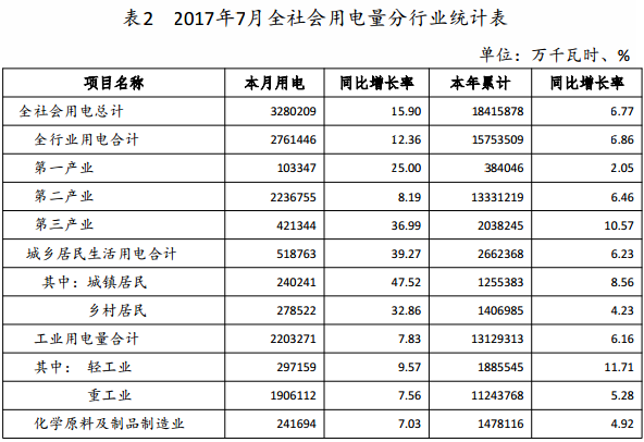 (二)發(fā)電機組利用小時情況。截止7月底,全省機組平均利用小時數(shù)2119小時,同比減少64小時。其中水電機組平均利用小時數(shù)為1511小時,同比增加48小時;火電為2284小時,同比增加15小時;新能源為845小時,同比減少368小時。統(tǒng)調(diào)火電機組平均利用小時數(shù)為2298小時,同比增加34小時。(三)發(fā)電裝機情況。截止7月底,全省裝機容量7642.19 萬千瓦,同比增加裝機689.49萬千瓦。其中水電裝機398.96萬千瓦,占比5.22%,火電裝機6410.44萬千瓦,占比83.88%,新能源裝機832.79千瓦,占比10.9%。二、電力消費情況(一)全社會用電量情況。2017年7月,全省全社會用電量 328.02億千瓦時,同比增長15.9%;累計用電量1841.59億千瓦時,同比增長6.77%。 - 3 - (二)分行業(yè)用電量情況。7月份,第一產(chǎn)業(yè)完成用電量 10.33億千瓦時,同比增長25%;第二產(chǎn)業(yè)完成用電量223.68億千瓦時,同比增長8.19%;第三產(chǎn)業(yè)完成用電量42.13億千瓦時,同比增長36.99%;全省城鄉(xiāng)居民生活用電51.88億千瓦時,同比增長39.27%。工業(yè)用電量220.33千瓦時,同比增長7.83%,其中,輕工業(yè)用電量29.72千瓦時,同比增長9.57%,重工業(yè)用電量 190.61億千瓦時,同比增長7.56%。 7月份,有色金屬行業(yè)用電量52.75千瓦時,同比增加9.14%。黑色金屬行業(yè)用電量11.68億千瓦時,同比減少3.18%?;瘜W(xué)原料及制品制造行業(yè)用電量24.17億千瓦時,同比增長7.03%。