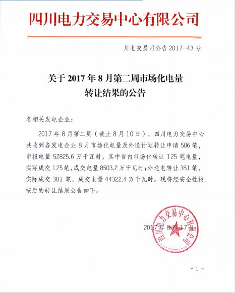 日前從四川電力交易中心獲悉,四川電力交易中心日前發(fā)布了關(guān)于2017年8月第二周市場化電量轉(zhuǎn)讓結(jié)果公告。截止8月第二周,四川電力交易中心共收到各發(fā)電企業(yè)8月市場化電量及外送計劃轉(zhuǎn)讓申請506筆,申報電量52825