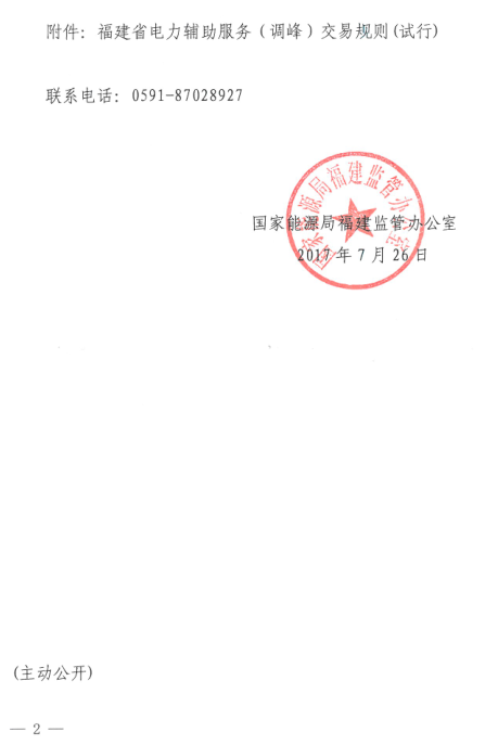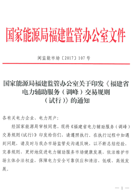 福建省電力輔助服務(調(diào)峰)交易規(guī)則(試行)印發(fā)