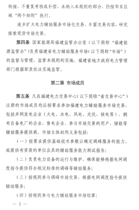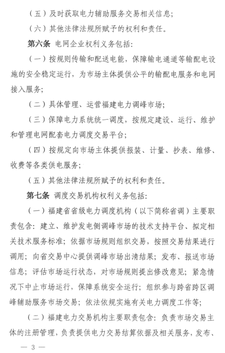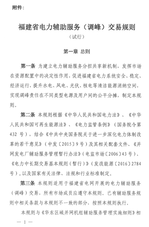 國家能源局福建監(jiān)管辦日前印發(fā)了《福建省電力輔助服務(調(diào)峰)交易規(guī)則(試行)》。規(guī)則試行于福建省電網(wǎng)開展的電力輔助服務(調(diào)峰)交易。本規(guī)則與《華東區(qū)域并網(wǎng)機組輔助服務管理實施細則》相銜接,不重復考核或