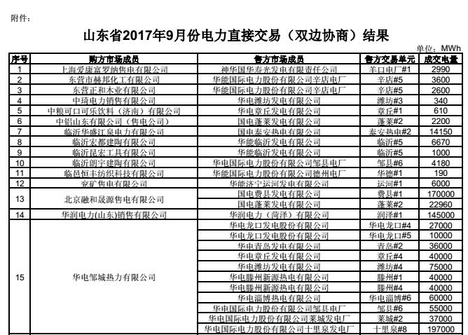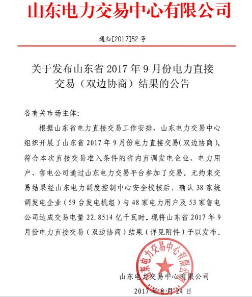 山東9月份電力直接交易(雙邊協(xié)商)結(jié)果:交易電量22.8514億千瓦時(shí)