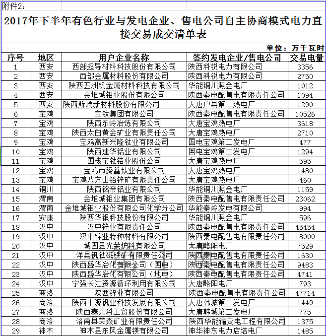 按照《關(guān)于印發(fā)陜西省電力用戶與發(fā)電企業(yè)直接交易實施細則(暫行)的通知》(陜發(fā)改運行〔2014〕1174號)、《關(guān)于完善用電政策促進有色金屬工業(yè)調(diào)結(jié)構(gòu)促轉(zhuǎn)型增效益有關(guān)工作的通知》(發(fā)展能源〔2016〕2462號)文件精神,結(jié)合《陜西省售電側(cè)改革實施細則(暫行)》有關(guān)要求,我省2017年下半年自主協(xié)商模式電力直接交易分為非有色行業(yè)和有色行業(yè)兩大類分別組織,經(jīng)電網(wǎng)企業(yè)電量安全校核,現(xiàn)對交易結(jié)果進行公布。