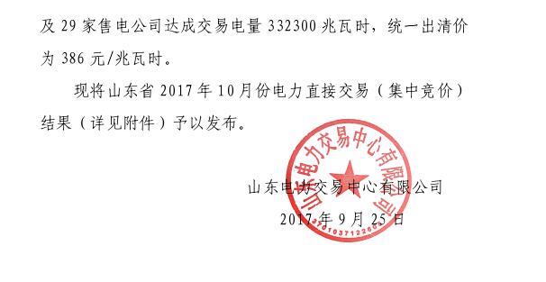 2017年9月25日,山東電力交易中心公布山東省2017年10月份電力直接交易(集中競(jìng)價(jià))結(jié)果。2017年9月21日,山東電力交易中心組織開展了山東省2017年10月份電力直接交易(集中競(jìng)價(jià))。無約束交易結(jié)果經(jīng)山東電力調(diào)度控制
