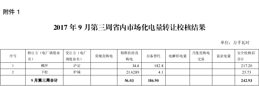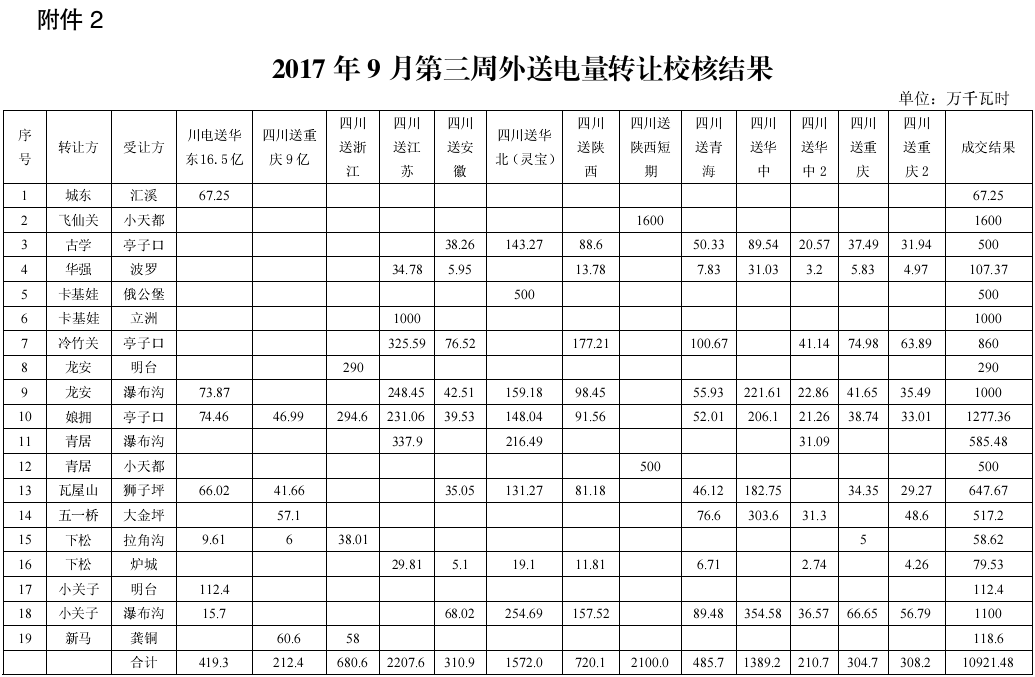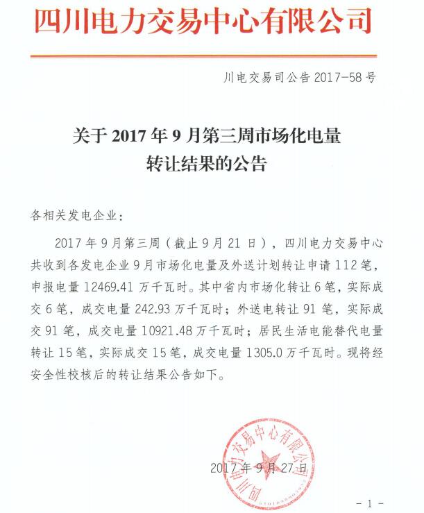 2017年9月第三周四川市場化電量轉(zhuǎn)讓成交電量12469.41萬千瓦時(shí)