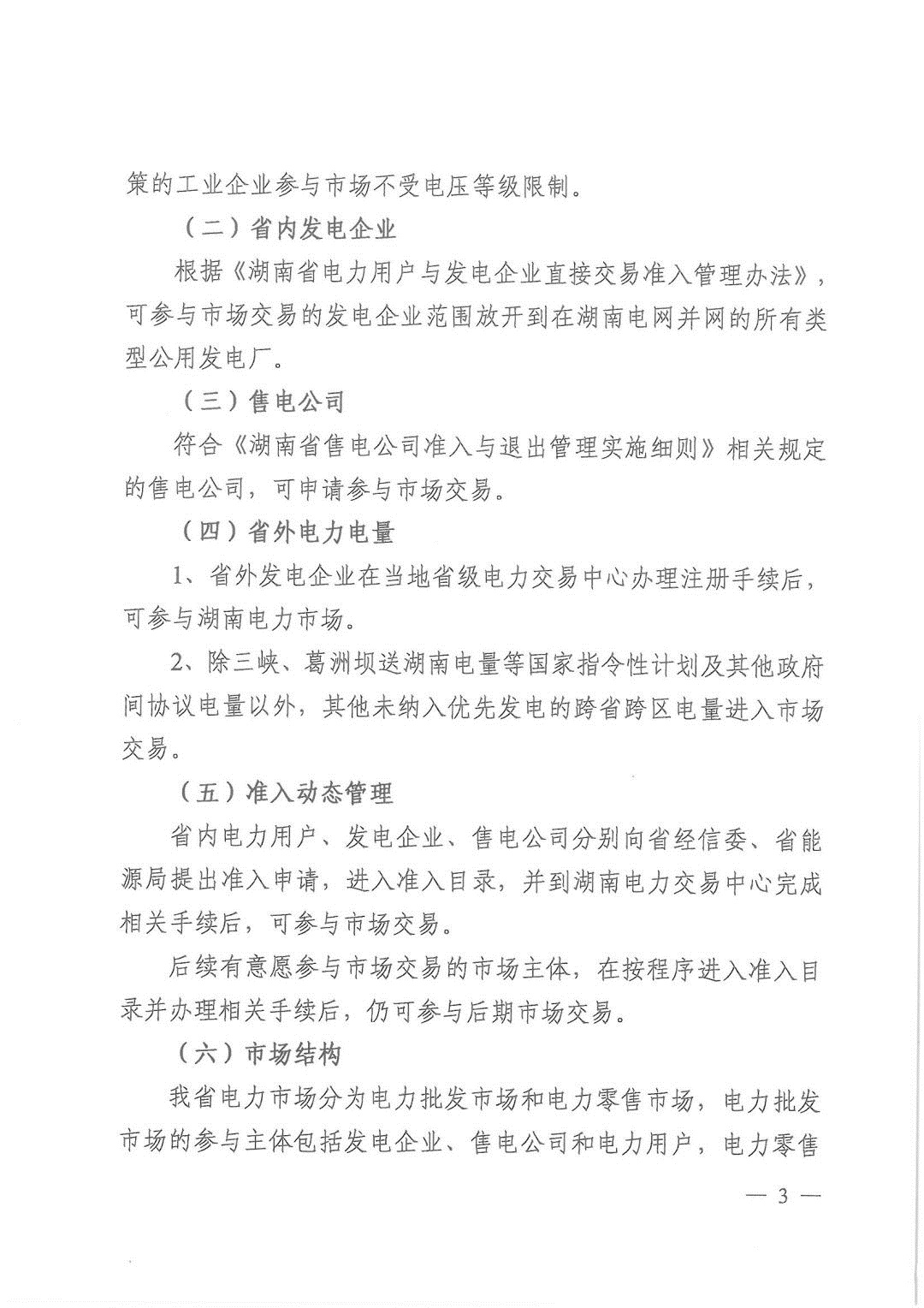 湖南省電力市場分為電力批發(fā)市場和電力零售市場,電力批發(fā)市場的參與主體包括發(fā)電企業(yè)、售電公司和電力用戶,電力零售市場的參與主體為售電公司和電力用戶。35KV及以上電壓等級的電力用戶可以參與批發(fā)市場交易,直接向發(fā)電企業(yè)購電;也可選擇參與零售市場交易,向售電公司購電;但兩種方式同期只能選擇其一。10KV及以下電壓等級用戶原則上不能直接參與批發(fā)市場交易,只能選擇零售零售市場交易向售電公司購電。