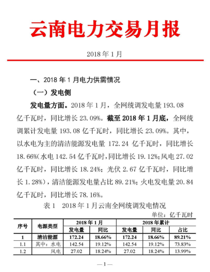 2018年1月云南電力交易月報(bào):省內(nèi)市場共成交電量70.04億千瓦時(shí) 同比增長39.78%