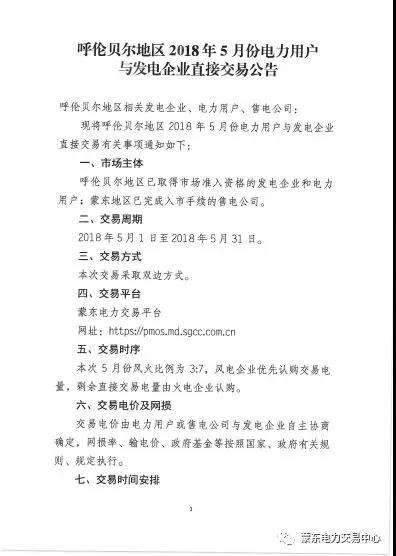 呼倫貝爾地區(qū)2018年5月電力用戶與發(fā)電企業(yè)直接交易 風(fēng)火比例3:7