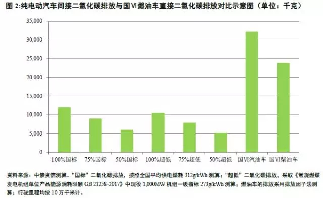 另外一個方面,從溫室氣體排放的角度測算,火電機(jī)組分別按照2016年全國供電煤耗312g/kWh和最新國家標(biāo)準(zhǔn)《常規(guī)燃煤發(fā)電機(jī)組單位產(chǎn)品能源消耗限額GB21258-2017》中現(xiàn)役1,000MW機(jī)組一級指標(biāo)273g/kWh進(jìn)行測算。測算結(jié)果如圖2所示,純電動汽車的二氧化碳間接排放,亦顯著低于燃油車輛的直接排放,這與火電廠能源利用效率高于普通車輛的燃油發(fā)動機(jī)有關(guān),而柴油車比汽油車更高的熱效率也反映在柴油車更低的二氧化碳排放水平上。