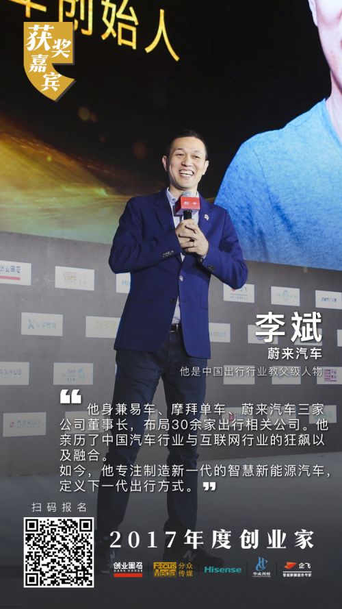 創(chuàng)業(yè)家訊(王妍)12月15日消息,由創(chuàng)業(yè)黑馬主辦、海信冠名的第十屆創(chuàng)業(yè)家年會今日在京舉行。蔚來汽車創(chuàng)始人李斌獲得汽車交通行業(yè)年度創(chuàng)業(yè)家 。 李斌的獲獎理由是:在與汽車、出行相關(guān)的互聯(lián)網(wǎng)領(lǐng)域內(nèi),