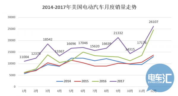 此外,2017年美國電動(dòng)汽車已經(jīng)累計(jì)銷售199,826輛,盡管未能達(dá)到20萬輛的年初預(yù)期,但預(yù)定目標(biāo)已是基本完成,相比2016年(158,614輛)同比增幅達(dá)到25%。