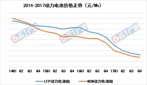 GGII數(shù)據(jù)顯示,2017年年底動力電池價格較2017年初下滑20%~25%。磷酸鐵鋰電池組價格從年初的1.8~1.9元/Wh下降到年底的1.45~1.55元/Wh。三元動力電池包價格從年初的1.7~1.8元/Wh下降到年底的1.4~1.5元/Wh。