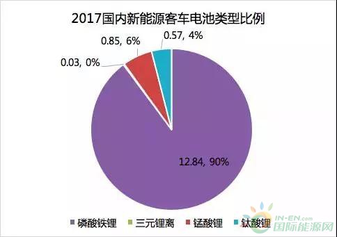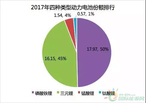 在2017全年的動力電池出貨中,磷酸鐵鋰電池占比50%,三元鋰電池占比45%,錳酸鋰電池占比4%,鈦酸鋰電池占比1%。