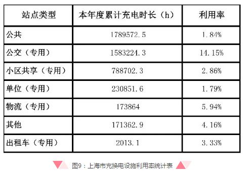 上海市充換電設施利用率的計算公式為:各站點利用率=各站點本年度累計充電時長/各站點本年度總時長,其中各站點本年度總時長的計算方式為:本站點類型充電設備數(shù)量x12(月)x 30(天)x 24(小時)。圖9為2017年度充換電設施按站點類型統(tǒng)計的利用率。