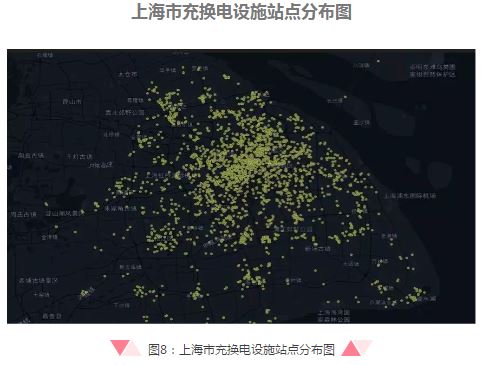 圖8為上海市充換電設施站點分布圖,全市分布的充電站點已超過5000個,從圖中可以看出全市充換電設施和全市充電量的行為發(fā)生一樣是集中在市區(qū),郊區(qū)充電站點則較為分散。全市充換電設施布局較為平均,基本實現(xiàn)了中心城區(qū)平均充電半徑3公里范圍。