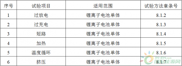 修改的項(xiàng)目包括:鋰離子電池單體過充、擠壓;鋰離子電池包或系統(tǒng)振動(dòng)、電子裝置振動(dòng)、機(jī)械沖擊、擠壓、浸水安全、熱穩(wěn)定性第一部分、鹽霧;電池系統(tǒng)過溫保護(hù)、外部短路保護(hù)、過充電保護(hù)、過放電保護(hù)。