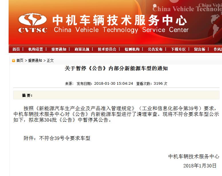 1月30日,中機中心網(wǎng)站發(fā)布關(guān)于暫?!豆妗穬?nèi)部分新能源車型的通知。通知指出,按照《新能源汽車生產(chǎn)企業(yè)及產(chǎn)品準(zhǔn)入管理規(guī)定》(工業(yè)和信息化部令第39號)要求,中機車輛技術(shù)服務(wù)中心對《公告》內(nèi)新能源車型進行了清理審查?,F(xiàn)將不符合要求車型公示如下,擬在第304批《公告》中暫停其公告。