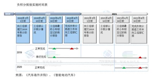 根據(jù)雙積分政策的實(shí)施時(shí)間表,雖然該政策的生效時(shí)間是2018年4月1日,但因?yàn)檎咭髲?019年度開始才設(shè)定新能源汽車的積分比例要求(10%)。而正常情況下,積分考核又是建立在上一年積分核算統(tǒng)計(jì)的基礎(chǔ)上進(jìn)行的,因此,對于2019年的新能源積分考核,實(shí)際要等到2020年的6月30日工信部等五部門聯(lián)合發(fā)布經(jīng)核實(shí)的2019年積分核算情況報(bào)告后才開始。2019年積分核算情況報(bào)告發(fā)布后的60天內(nèi),有負(fù)積分的企業(yè)就需要完成積分的交易了。