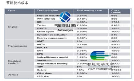 對于降低油耗的節(jié)能技術(shù),近年來行業(yè)通常采用減小發(fā)動機(jī)排量、降低車身重量、采用渦輪增壓技術(shù)、節(jié)油變速箱、48V等技術(shù)措施。依據(jù)相關(guān)行業(yè)機(jī)構(gòu)的估算,渦輪增壓技術(shù)能夠幫助降低7%的油耗,需要增加的成本為3000元左右,而48V節(jié)油效果估算為5%左右,需要增加的成本為2500元左右。