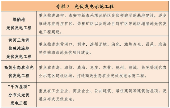 光伏。充分利用塌陷地、荒地、鹽堿地,發(fā)展集中式光伏發(fā)電,重點打造魯西南塌陷地光伏發(fā)電基地和黃河三角洲鹽堿灘涂地光伏發(fā)電基地。結(jié)合高效農(nóng)業(yè)區(qū)、產(chǎn)業(yè)園區(qū)規(guī)劃,積極推進(jìn)分布式光伏發(fā)電,建設(shè)一批分布式光伏發(fā)電規(guī)?;瘧?yīng)用示范區(qū)和風(fēng)光、農(nóng)光、漁光等綜合利用示范區(qū)。到2020年,光伏發(fā)電裝機容量達(dá)到1000萬千瓦。