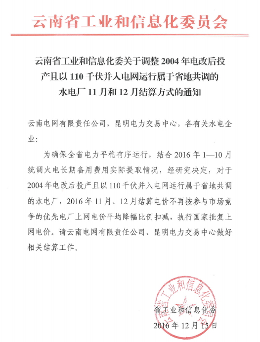 云南調(diào)整110千伏并入電網(wǎng)運(yùn)行的水電廠11月和12月結(jié)算方式的通知