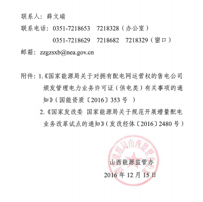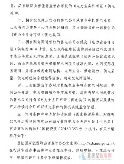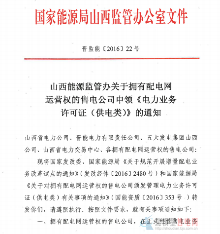 山西能源監(jiān)管辦關于擁有配電網(wǎng)運營權的售電公司申請《電力業(yè)務許可證(供電類)》的通知近日發(fā)布,一起來看通知全文: