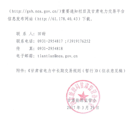 關于征求《甘肅省電力中長期交易規(guī)則(暫行)》(征求意見稿)意見建議的函近日發(fā)布,一起來看全文: