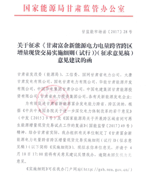 甘肅富余新能源電力電量跨省跨區(qū)增量現(xiàn)貨交易實施細則(試行)(征求意見稿)