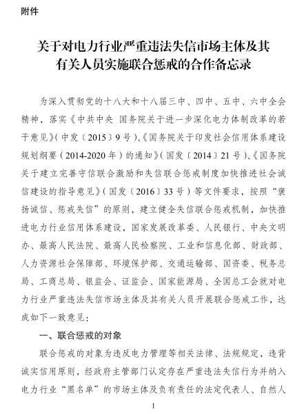 附件:關(guān)于對(duì)電力行業(yè)嚴(yán)重違法失信市場(chǎng)主體及其有關(guān)人員實(shí)施聯(lián)合懲戒的合作備忘錄
