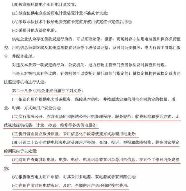 第四章為監(jiān)督管理, 本章說明了供電企業(yè)和用戶均受有關(guān)部門和社會各界的監(jiān)督,對違反本《條例》的所有行為,任何單位和個人都有權(quán)舉報和投訴。