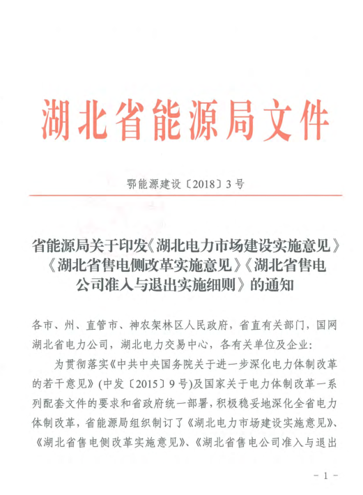 湖北省能源局日前印發(fā)了《湖北電力市場建設(shè)實施意見》、《湖北省售電側(cè)改革實施意見》、《湖北省售電公司準(zhǔn)入與退出實施細則》。在《湖北省