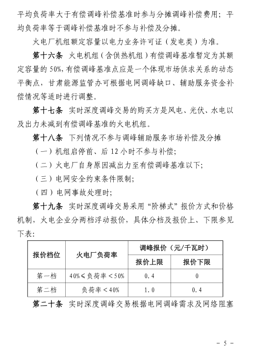 《甘肅省電力輔助服務(wù)市場運營規(guī)則(試行)》 單機容量100MW及以上的燃煤、燃氣等火電機組參與調(diào)峰