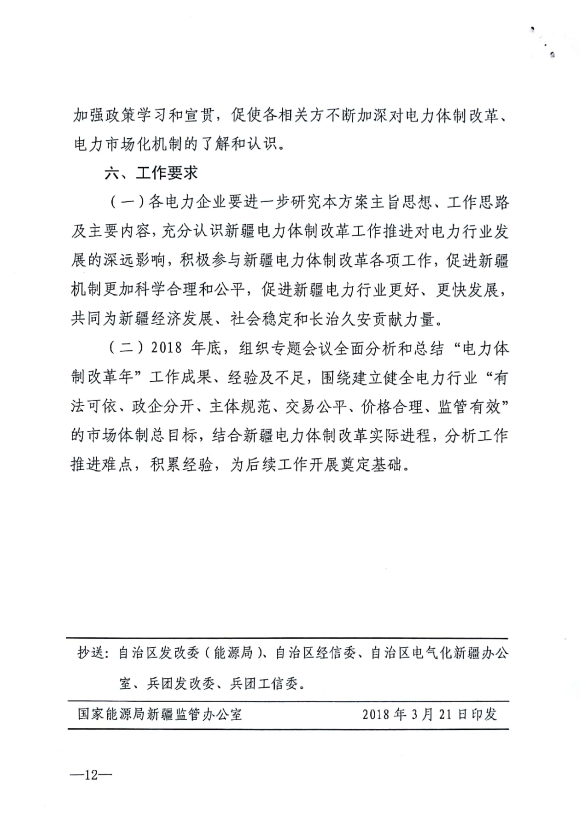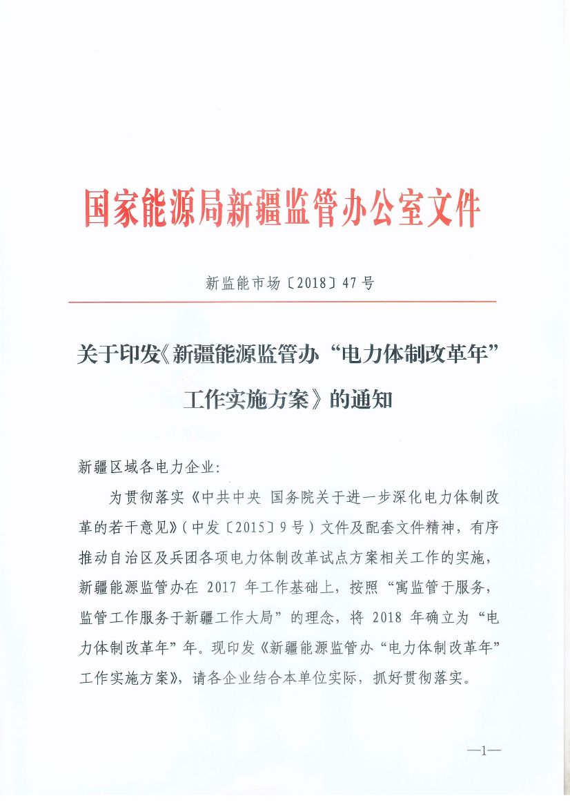 關(guān)于印發(fā)《新疆能源監(jiān)管辦電力體制改革年工作實(shí)施方案》的通知。