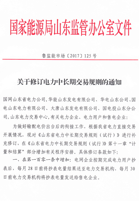 《山東省電力中長(zhǎng)期交易規(guī)則》修訂增加4條規(guī)則