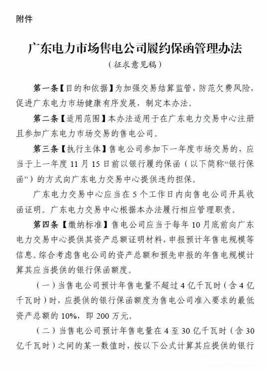 近日,南方能源監(jiān)管局面向市場主體公開征求《廣東電力市場售電公司履約保函管理辦法》(以下簡稱《履約保函辦法》)意見,標(biāo)志著廣東電力市場風(fēng)險(xiǎn)防范機(jī)制建設(shè)向前邁出了重要一步。今年廣東省內(nèi)簽約用戶的個(gè)別售電