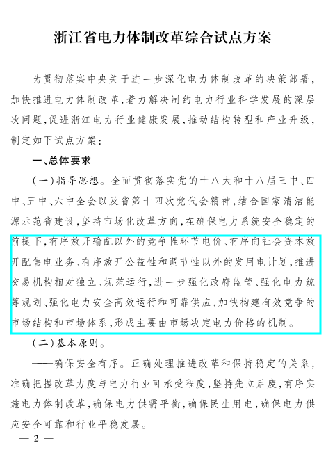 浙江省電力體制改革綜合試點方案印發(fā):建立以電力現(xiàn)貨市場為主體的省級電力市場體系