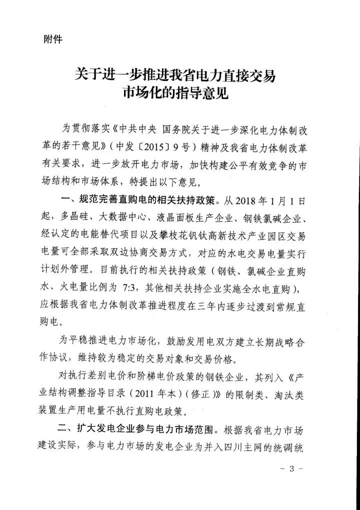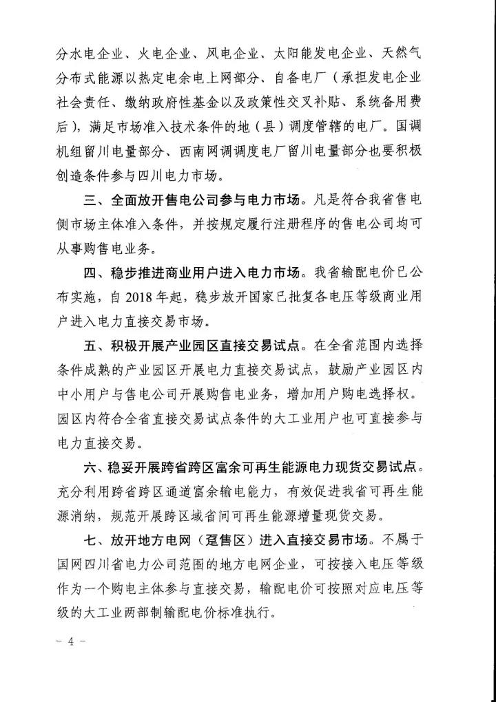 四川省經(jīng)信委、四川省發(fā)改委、國家能源局四川監(jiān)管辦、四川省能源局日前聯(lián)合下發(fā)了《關(guān)于進(jìn)一步推進(jìn)我省電力直接交易市場化的指導(dǎo)意見》。意見中稱,將規(guī)范完善直購電的相關(guān)扶持政策,擴(kuò)大發(fā)電企業(yè)參與電力市場范圍,全面放開售電公司參與電力市場,穩(wěn)步推進(jìn)進(jìn)商業(yè)用戶進(jìn)入電力市場,積極開展產(chǎn)業(yè)園區(qū)直接交易試點,穩(wěn)妥開展跨省跨區(qū)富余可再生能源電力現(xiàn)貨交易試點,放開地方電網(wǎng)(躉售區(qū))進(jìn)入直接交易市場,有序推進(jìn)其他特殊行業(yè)企業(yè)完全電力市場化。詳情如下: